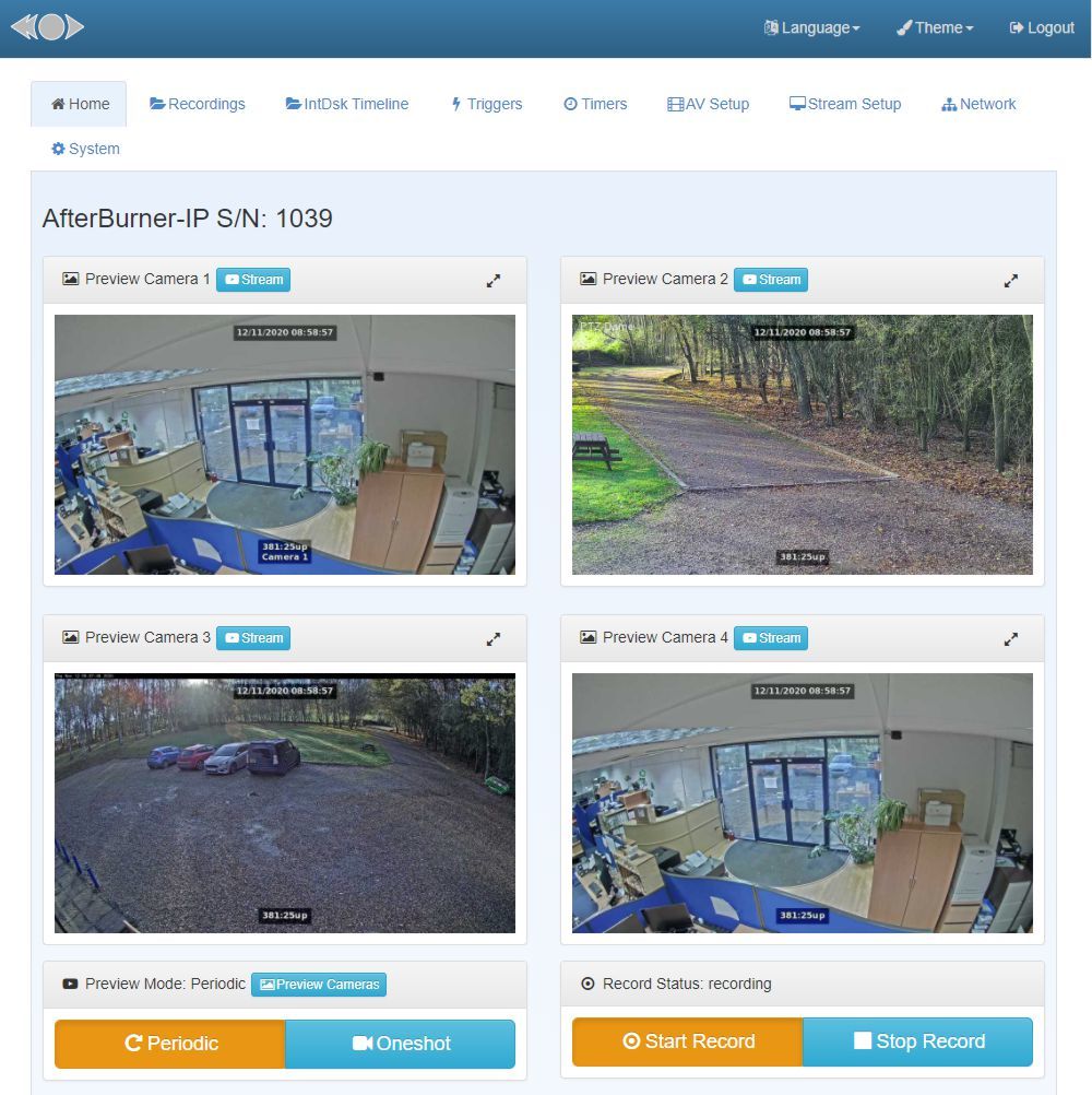 Whilst recording, AfterBurner-IP can re-stream the four cameras to video with configurable frame-rate and resolution. This feature allows for full quality local recording with simultaneous live re-streaming at lower bit-rates to save bandwidth. Furthermore, AfterBurner-IP is Onvif-s compatible so interfacing to VMS, such as Milestone, is straight forward and PTZ cameras are supported as standard.
